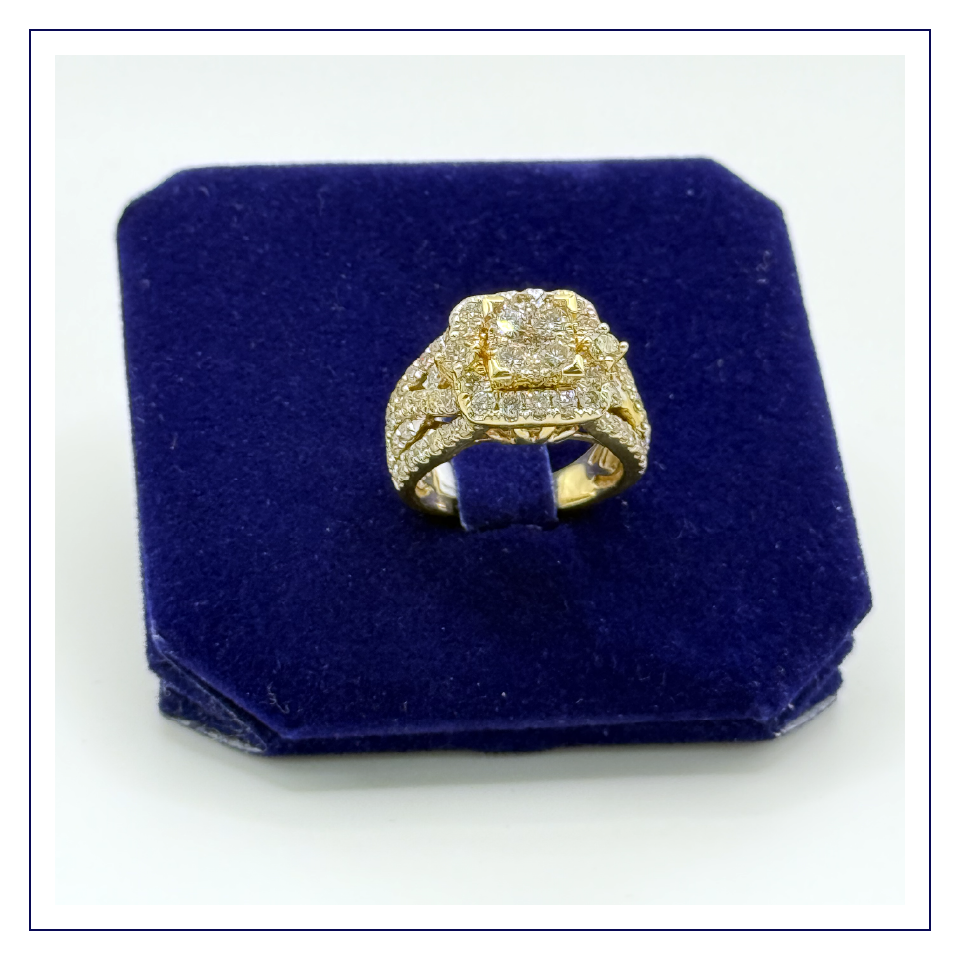 Bold architecture meets extraordinary brilliance. Crafted in rich 10K yellow gold, this structural cocktail ring features a commanding geometric center heavily paved with natural diamonds. The unique “dual horn” split-shank design offers a thick, luxurious gold presence and an impressive 3.00 carats of total diamond weight.