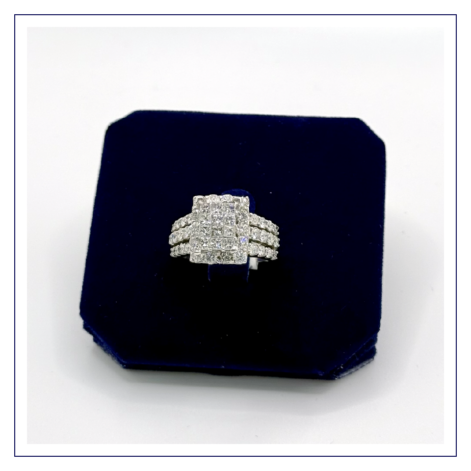 Modern edge and intense light return. This heavy 14K white gold ring showcases a dramatic four-column center composed entirely of tightly set, invisible-style princess-cut diamonds. The tiered, multi-row diamond band frames the rectangular centerpiece perfectly, resulting in a clean, sophisticated, and incredibly substantial ring.