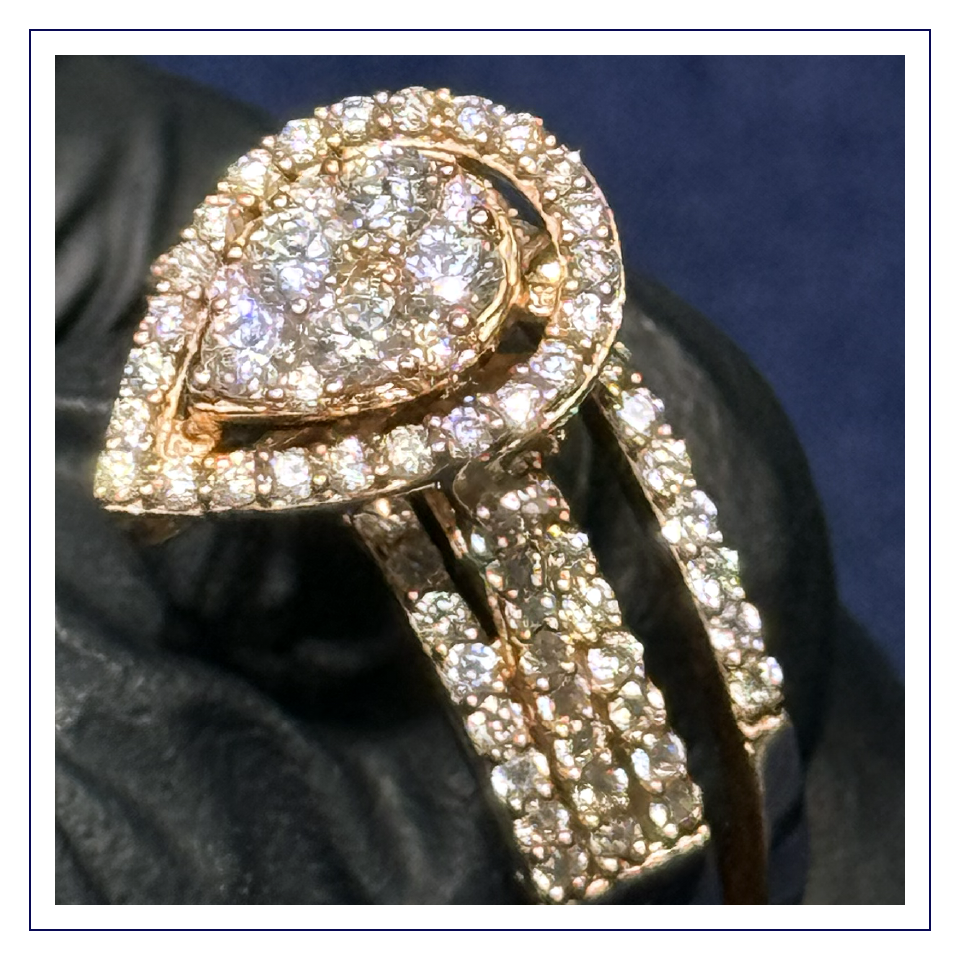 Elegance meets modern romance. This breathtaking 14K rose gold ring features a brilliant pear-shaped center framed by a dazzling diamond halo. The luxurious multi-row diamond band adds exceptional volume and continuous sparkle, creating a striking silhouette on the hand. Perfect for an unforgettable engagement or a bold statement piece.