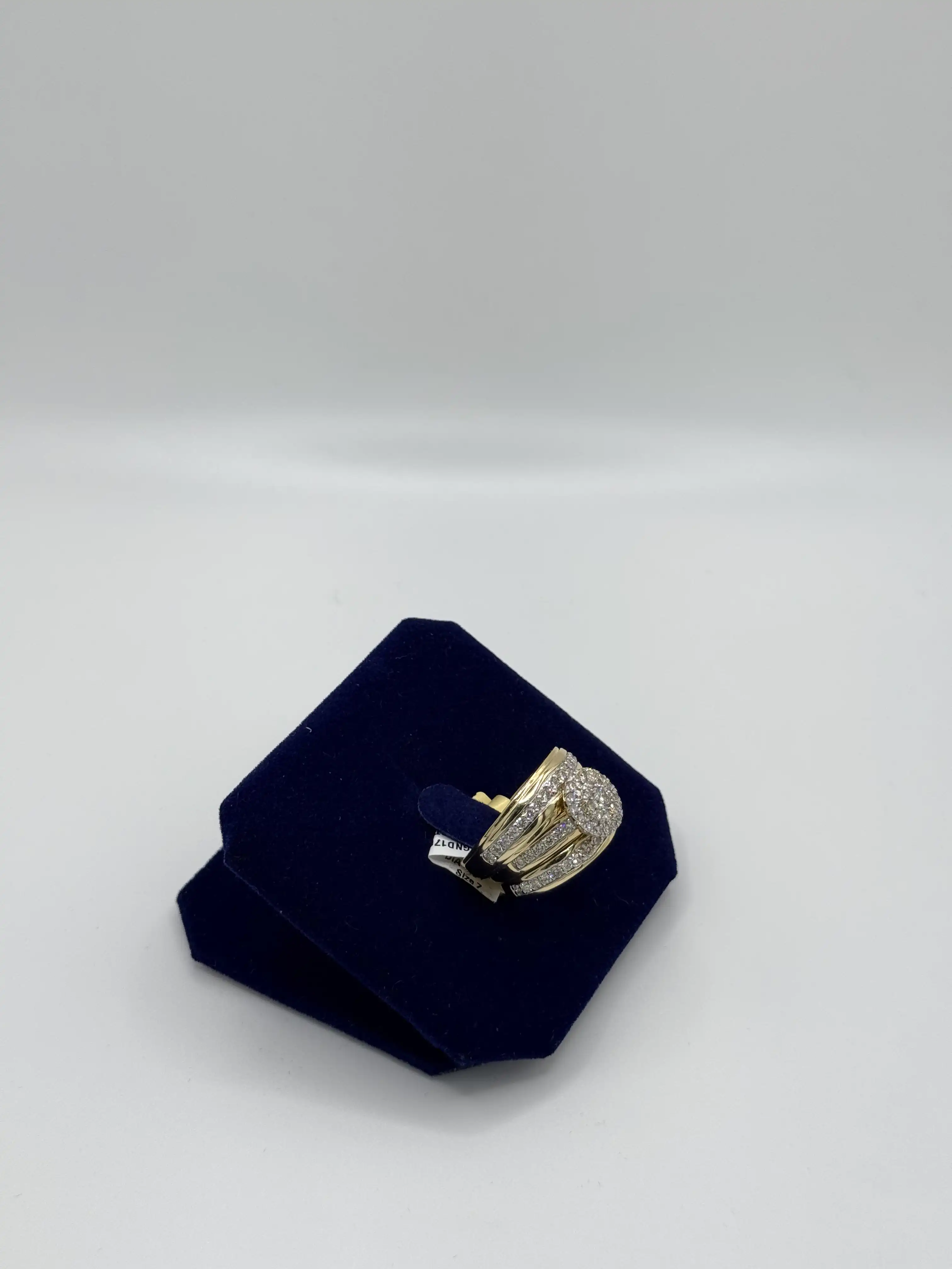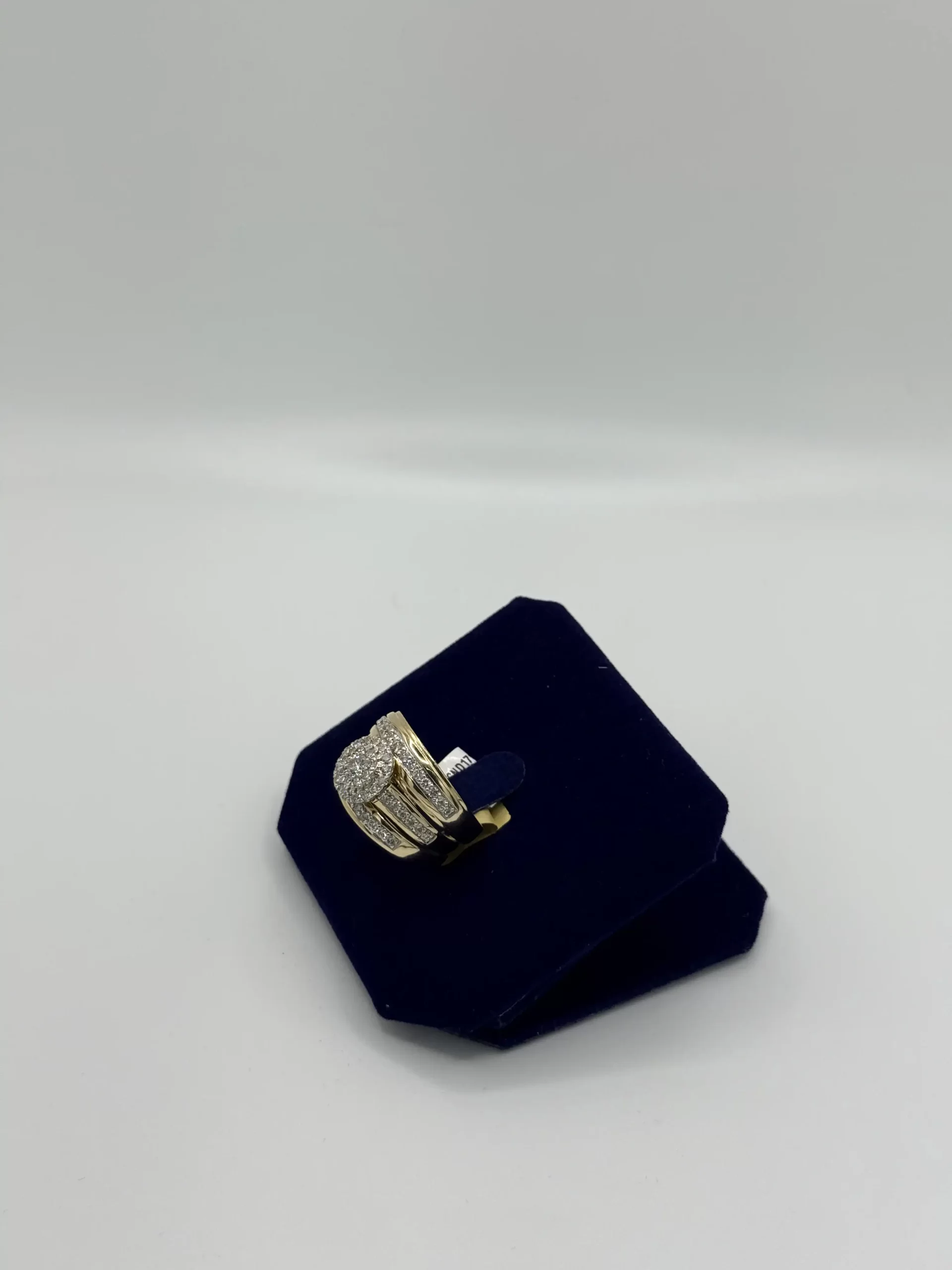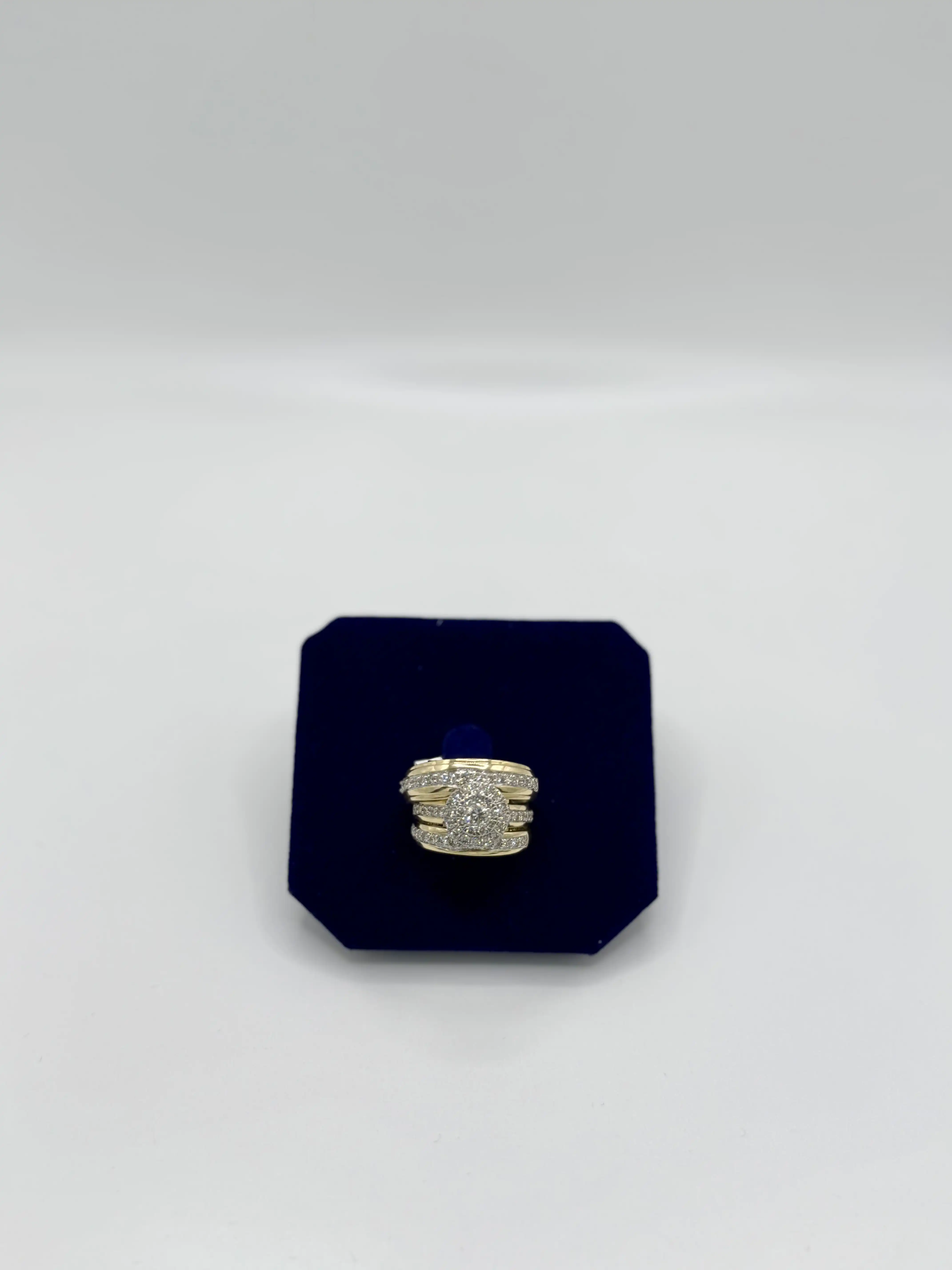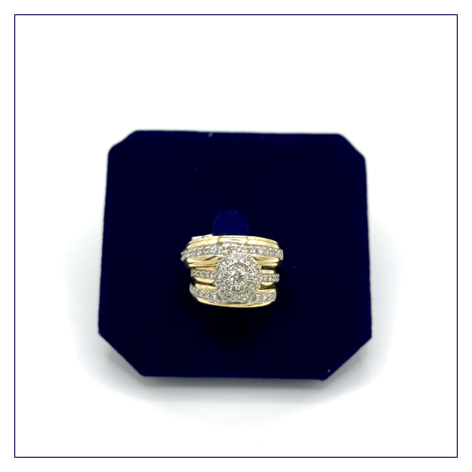 A complete celebration of your journey. This stunning trio set in 14k yellow gold offers a seamless, high-sparkle silhouette designed to be worn together in perfect harmony. The engagement ring features a brilliant round-cut center cluster and halo, flanked by two matching diamond-set bands that cradle the center for a balanced, wide-profile look. With a total weight of 1 3/8 carats of natural diamonds, this set combines the traditional warmth of yellow gold with a modern, layered aesthetic. The channel-set and pavé accents on the bands ensure a continuous stream of light from every angle. It is the perfect choice for the couple looking for a complete, breathtaking bridal look in one exquisite package.