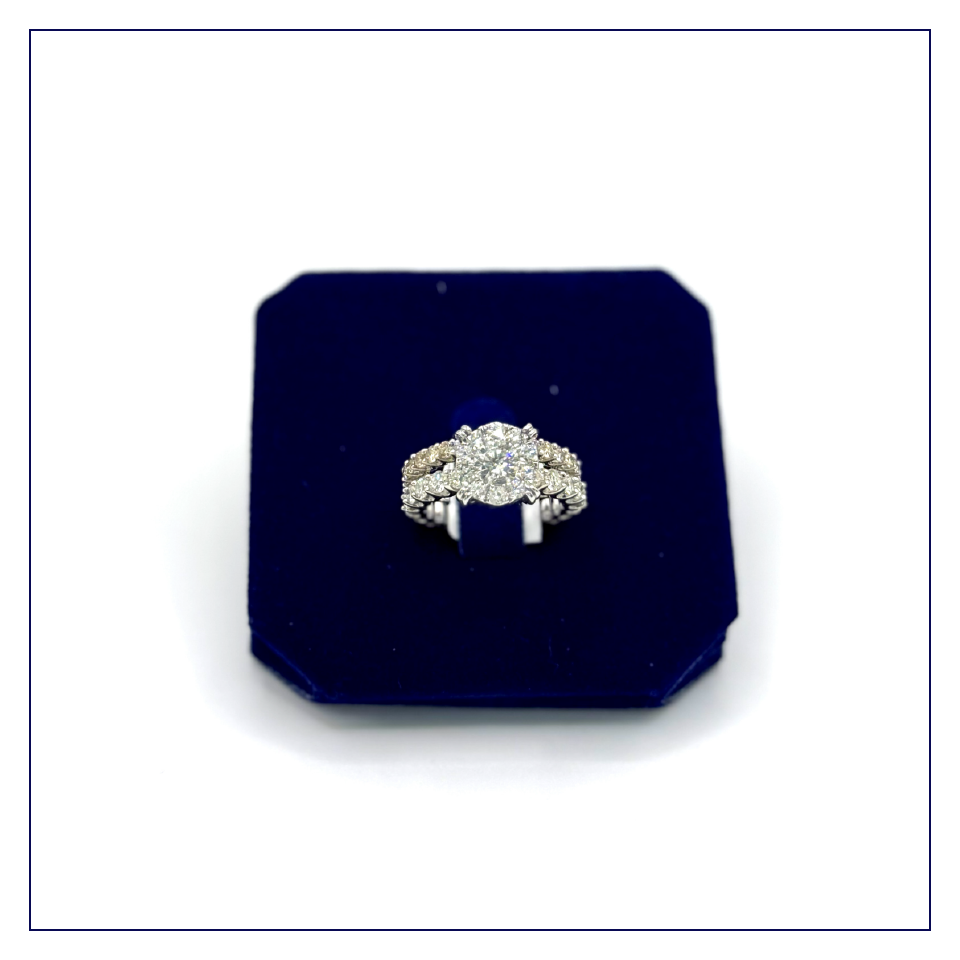 Unrivaled Brilliance. Pure Opulence. For the one who wants it all, this 14k white gold masterpiece delivers a staggering 5.25 total carats of natural diamonds. The design features a bold, oversized round cluster center that mimics the look of a singular, massive stone, radiating fire from every facet. The brilliance doesn’t stop at the center; the band is a work of art in itself, featuring multiple rows of handset natural diamonds that extend around the shank for a heavy, luxurious feel. This is a high-profile “power ring” designed for major milestones and red-carpet moments. Crafted with precision in bright 14k white gold, it is the ultimate expression of luxury and a crown jewel for any collection.