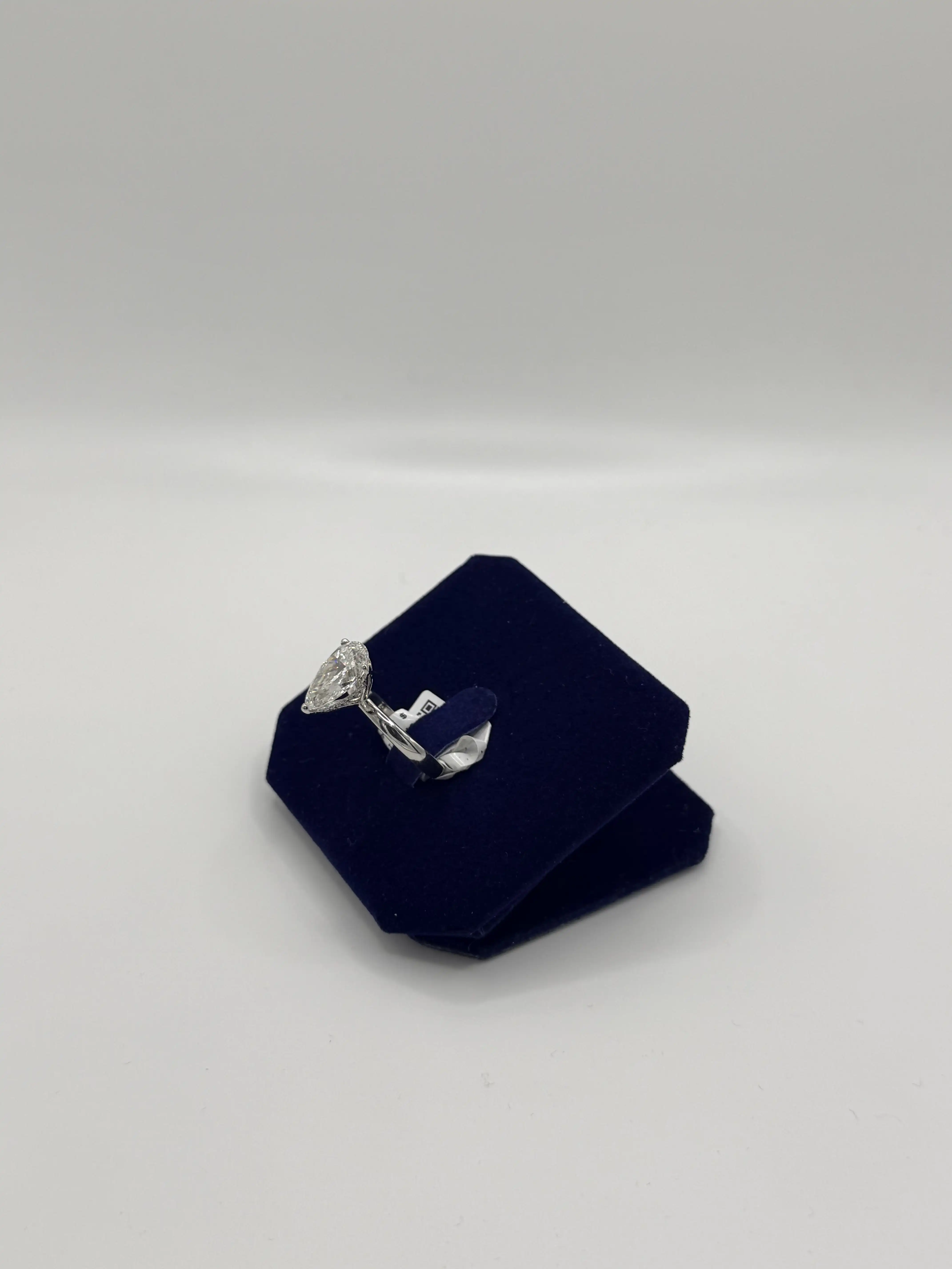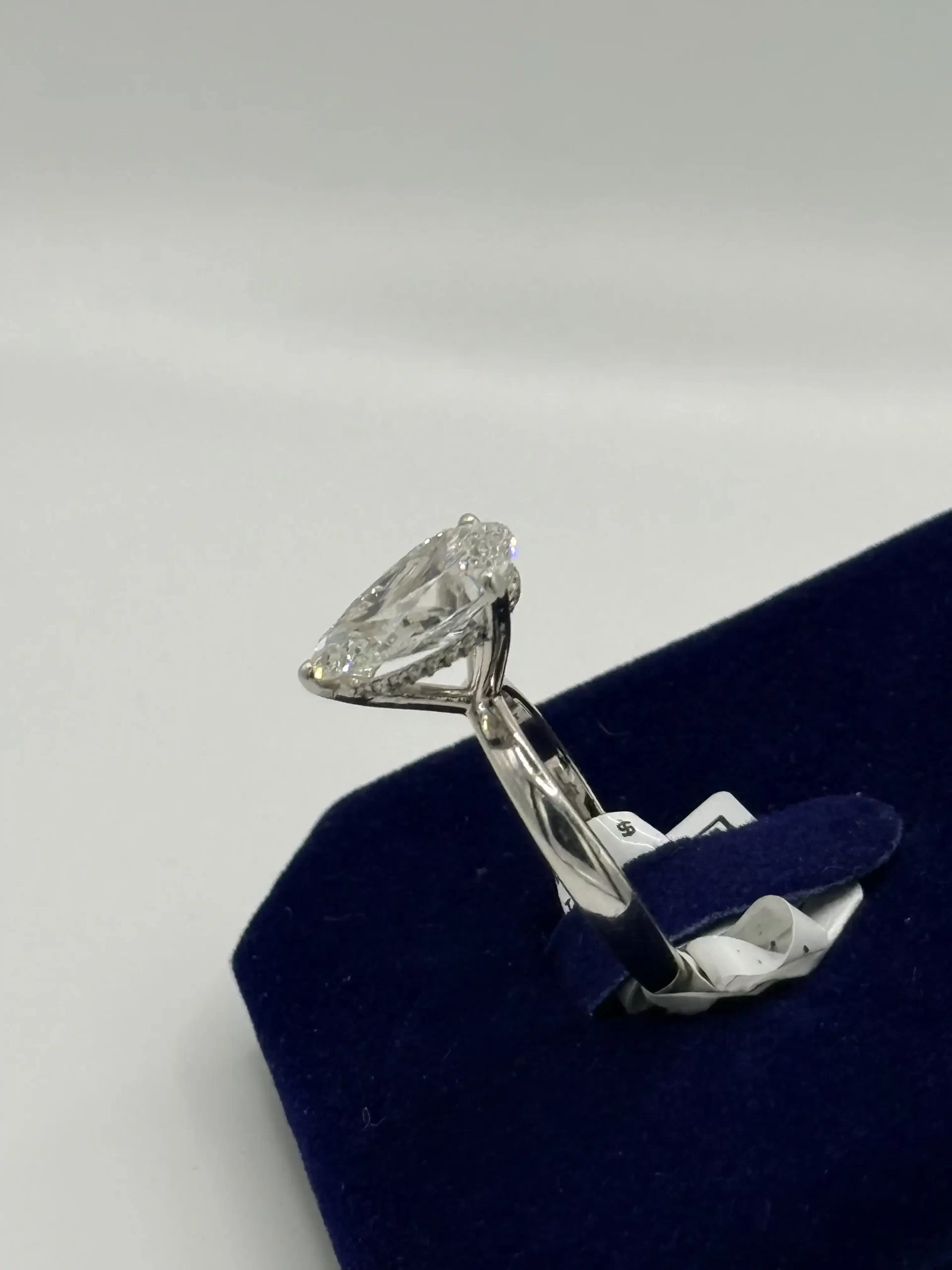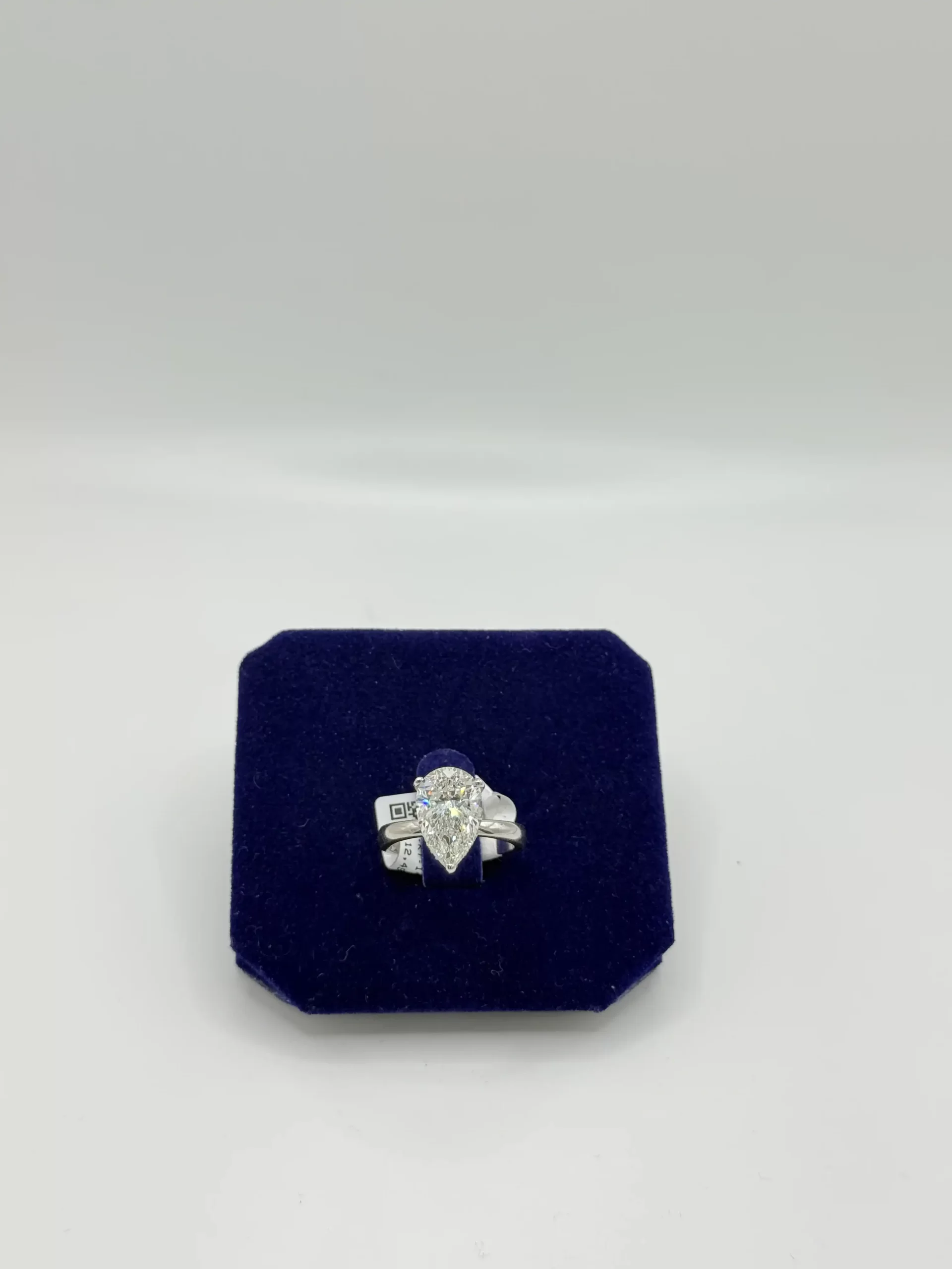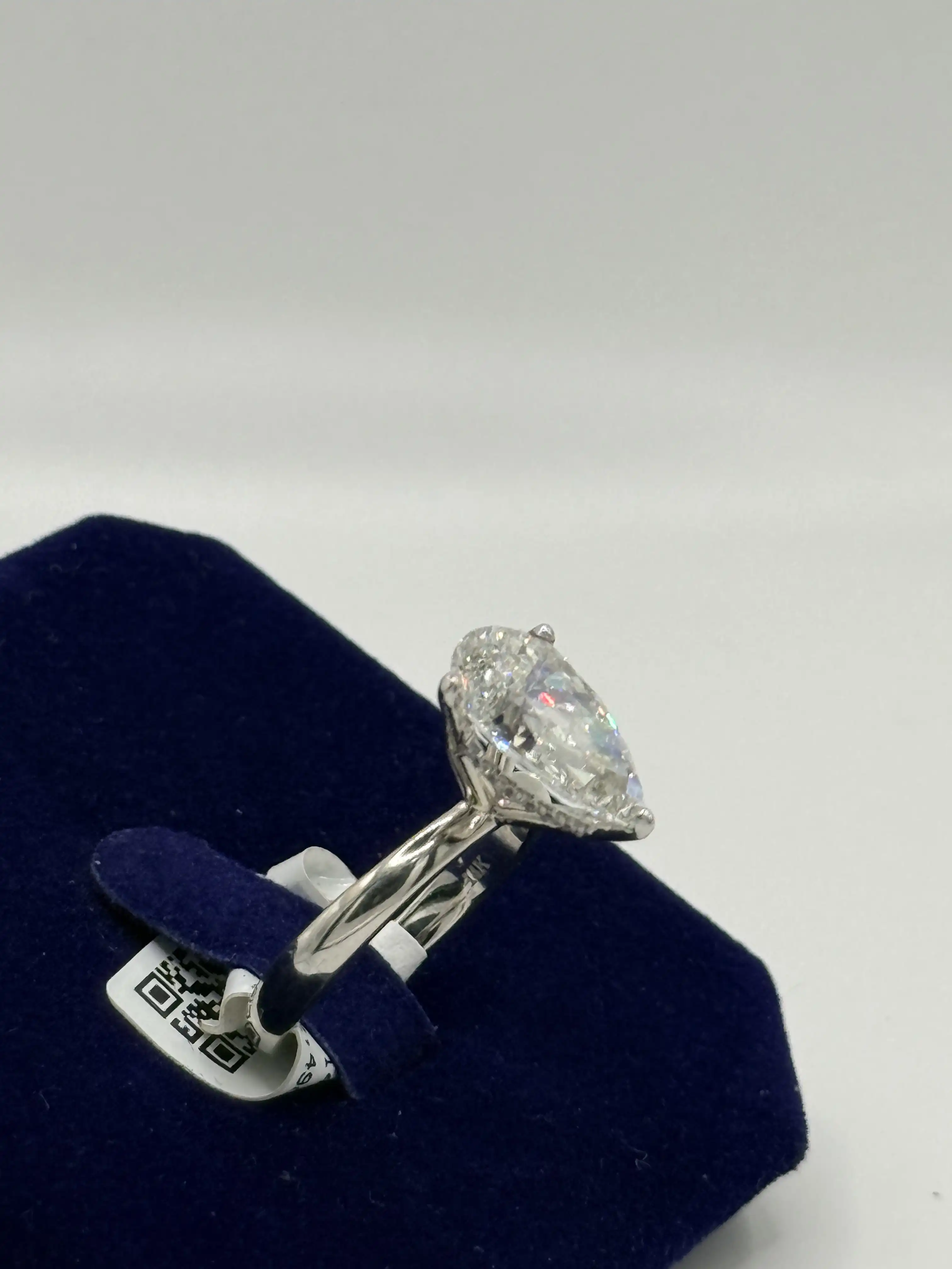 Breathtaking scale meets elegant contour. This spectacular 14k white gold ring is defined by its massive, show-stopping 3.92-carat pear-shaped center stone. The teardrop silhouette is universally flattering, known for elegantly elongating the finger while delivering incredible brilliance and fire. Featuring premium lab-grown diamonds, this piece offers uncompromising size and luxury with a modern, mindful origin. The magnificent center diamond takes center stage, perfectly complemented by a delicate, slender band accented with delicate pavé diamonds, bringing the total weight to a luxurious 4.10 carats. This is a true modern masterpiece designed for the bride who wants maximum impact and timeless sophistication.